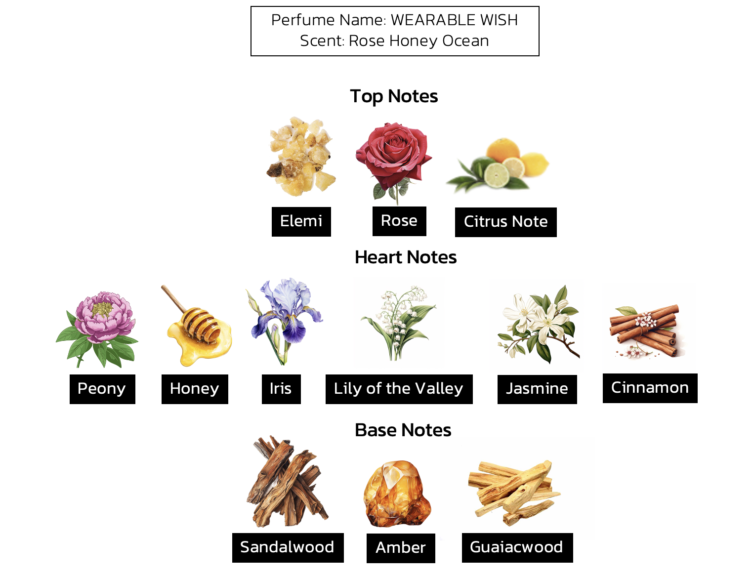 ชวนสัมผัสความหอมของดอกกุหลาบ น้ำผึ้ง และความสดชื่นจากกลิ่น Ocean พร้อมความอบอุ่นจาก Sandalwood และ Guaiawood ที่จะทำให้ทุกความปรารถนาของคุณกลายเป็นจริง น้ำหอม Wearable Wish จึงมีความ หรูหรา และ มีเสน่ห์ เปรียบเสมือนความปรารถนาที่เป็นจริงอย่างละเอียดอ่อนและอบอุ่น 🍯🌊🪵